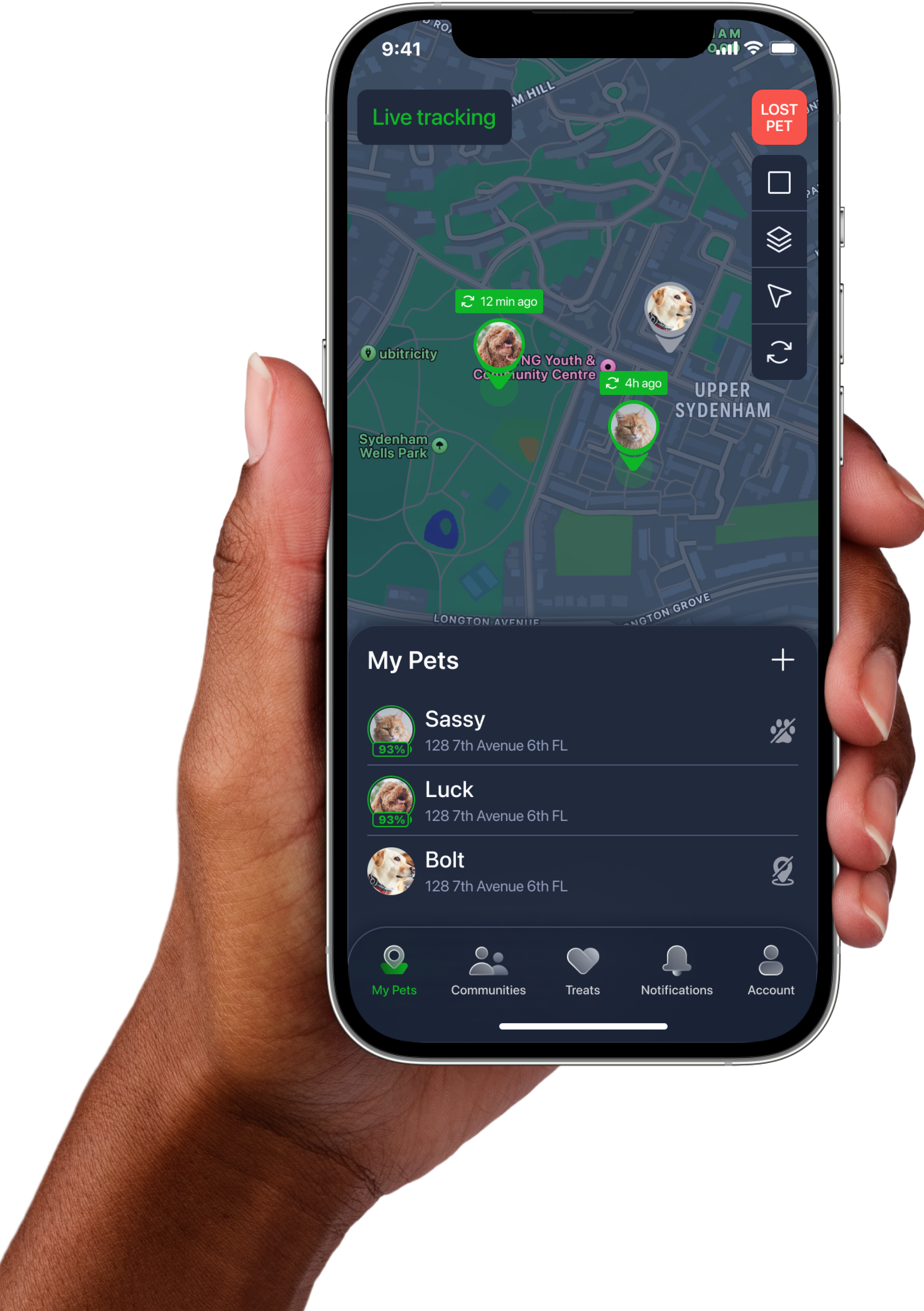 Notify your Community when your pet is missing. They receive your pet's location to help find them.